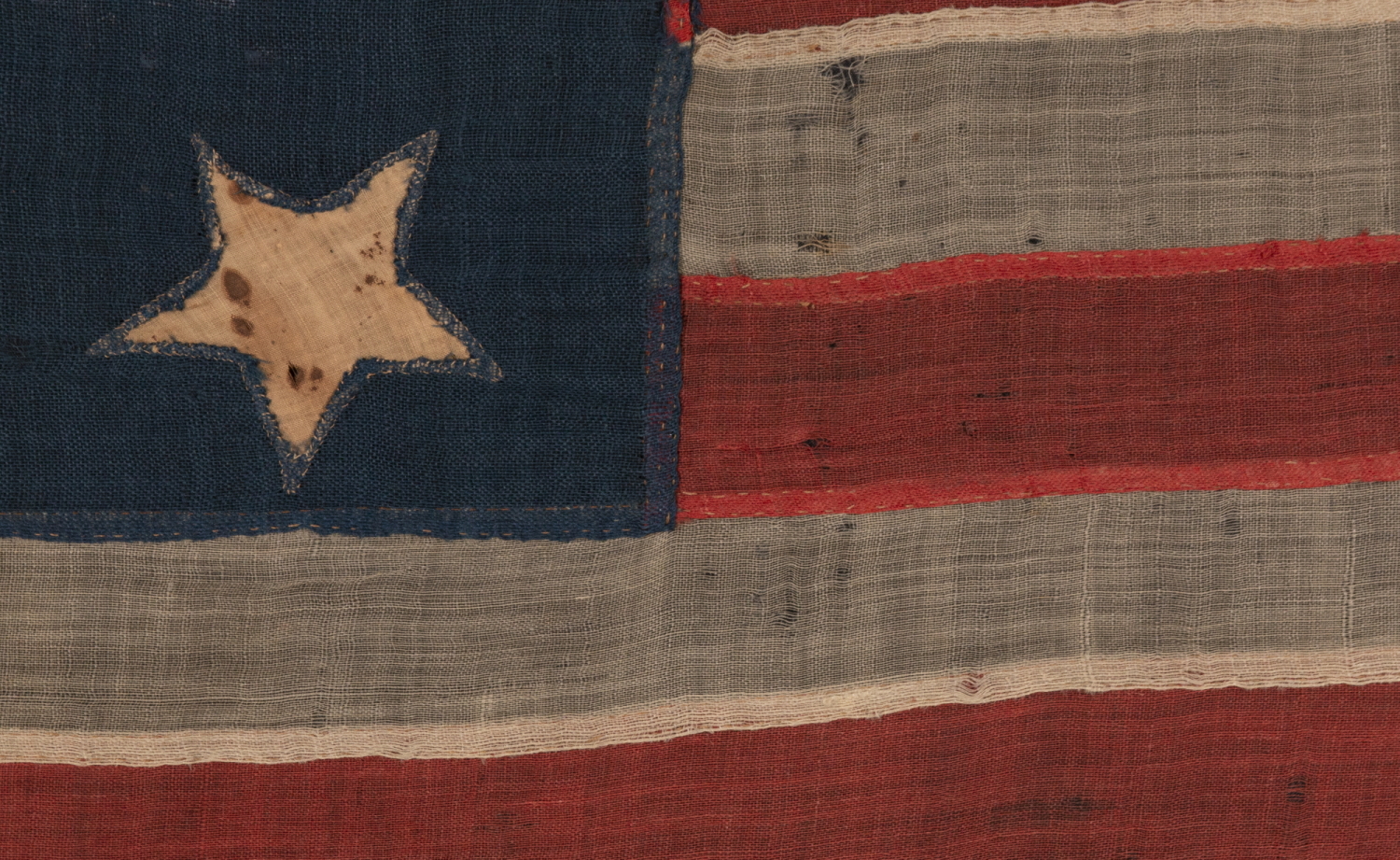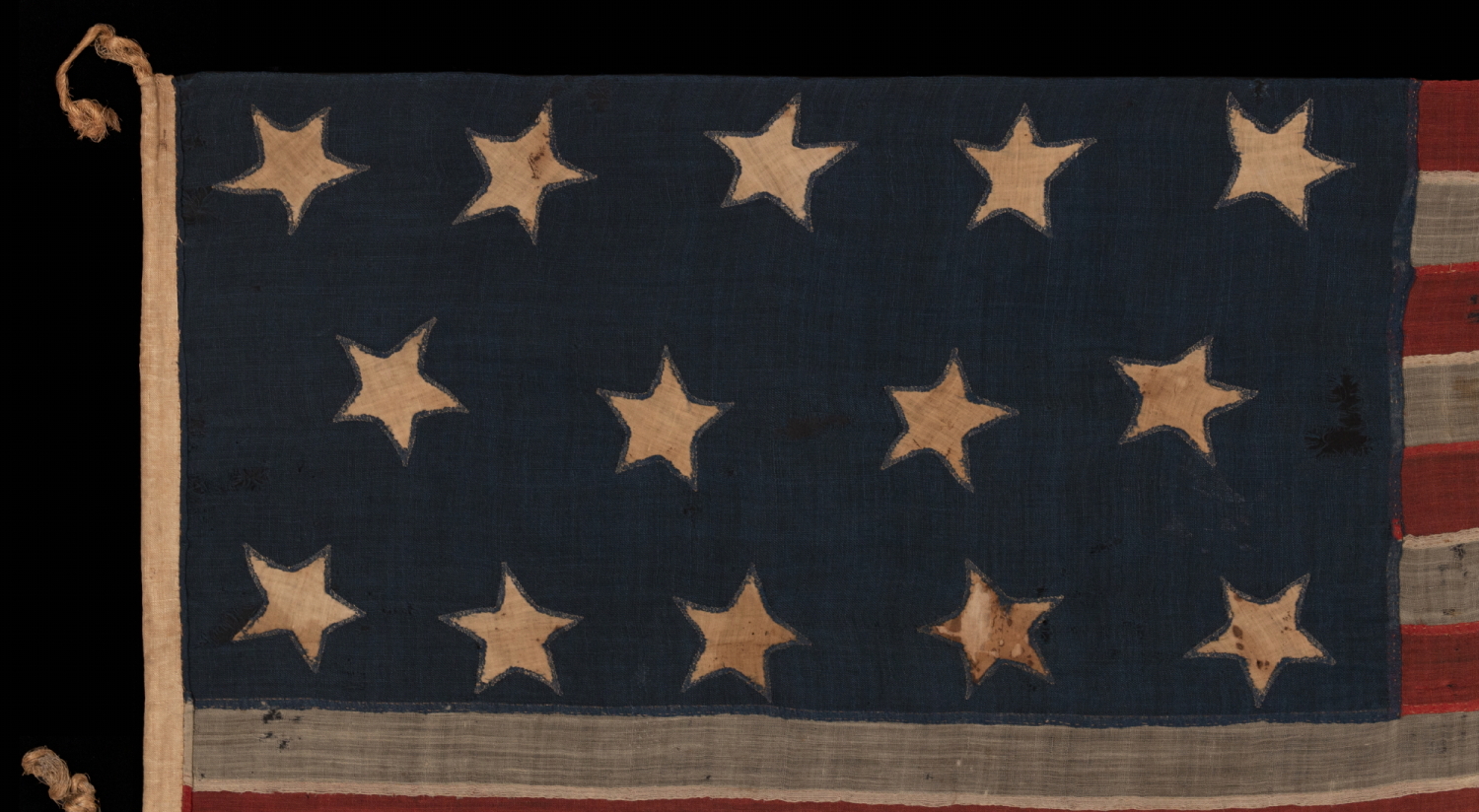 The canton and stripes of the flag are made of wool bunting. The stars are made of cotton and are single-appliquéd. This means that they were stitched to one side only, then a cut-out was made on the opposite side, and the fabric under-hemmed, so that one star could be seen on both sides of the canton. I always find single-appliquéd stars more desirable, not only because they are evidence of a more difficult level of seam work and stitching, but also because they are more visually intriguing. Both the sewing itself and stretching of the fabrics over time result in stars that can develop very irregular shapes, which is certainly the case here.
