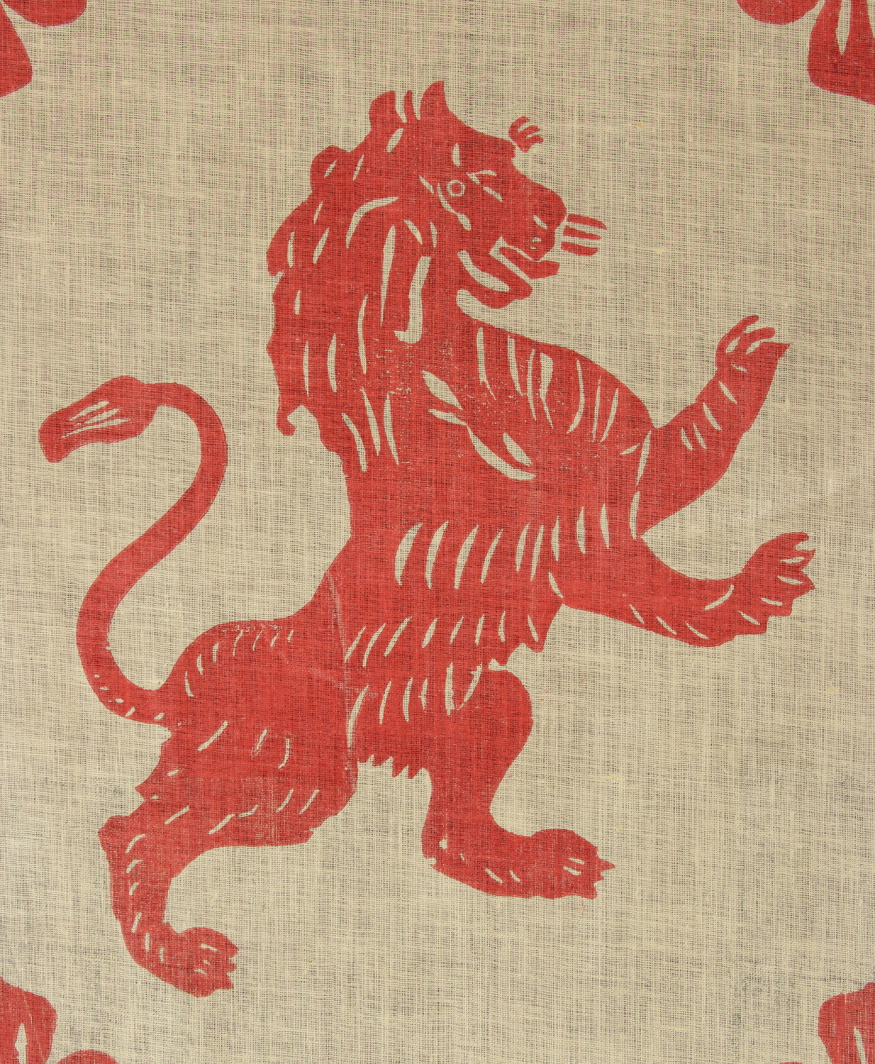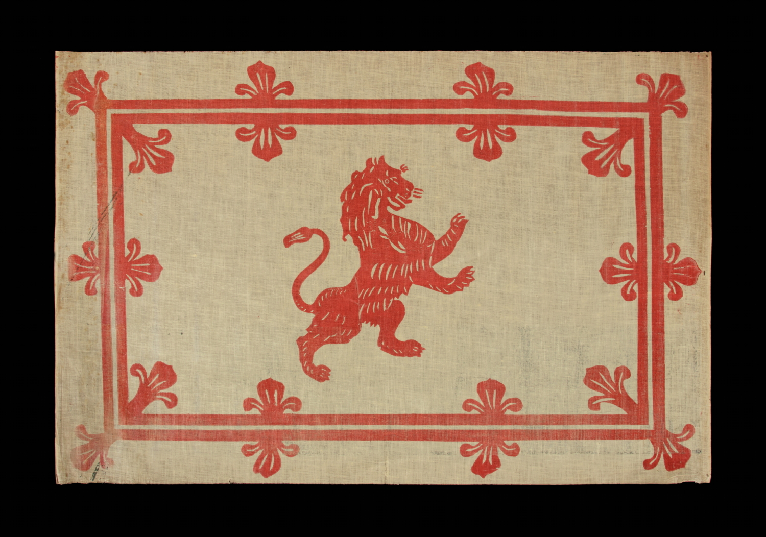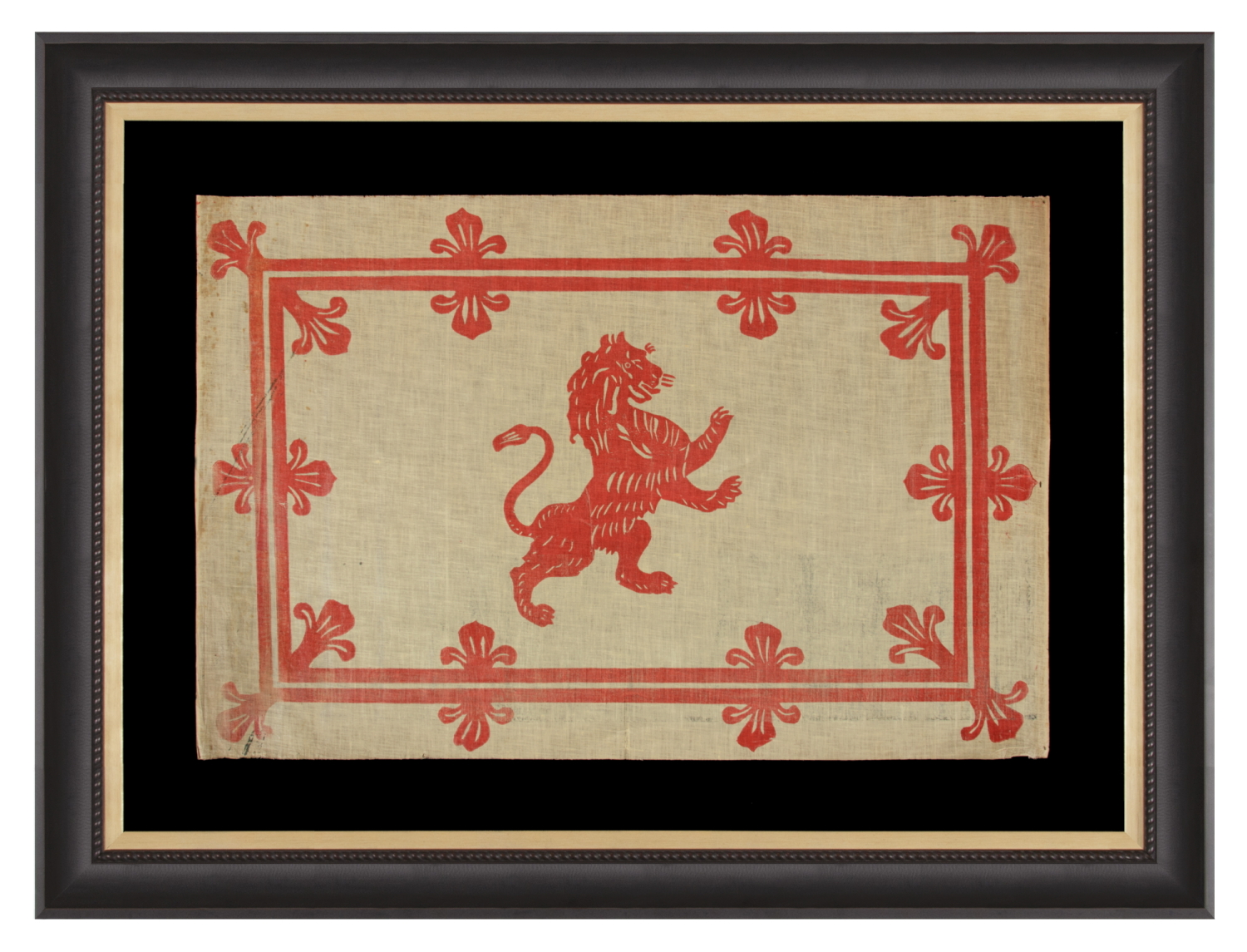 Parade flag in the form of the Royal Flag of Scotland, printed on coarse, glazed cotton. Made during the last quarter of the 19th century, this is an especially early example among flags in this style that one might encounter in private hands, likely produced for use at a World’s Fair event, the likes of which rose to great popularity in that era.