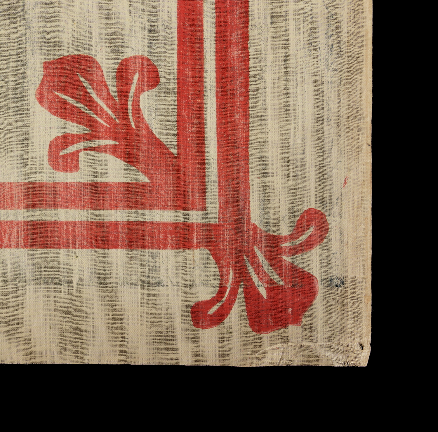 Condition: There is moderate fading of the saffron yellow ground, accompanied by some misprint and fading of the red pigment in limited areas. There is minor to modest soiling at both the hoist (right as displayed here) and fly (right) ends. There are instances of thin streaks of dark staining running diagonally along the fly, in addition to some black transfer or staining adjacent to the lower and hoist end borders, in the bottom, hoist end quadrant. There are pinprick-sized holes along the hoist, where the flag was once affixed to a wooden staff, and very minor losses and fraying along the top and bottom edges. Many of my clients prefer early flags to show their age and history of use. |