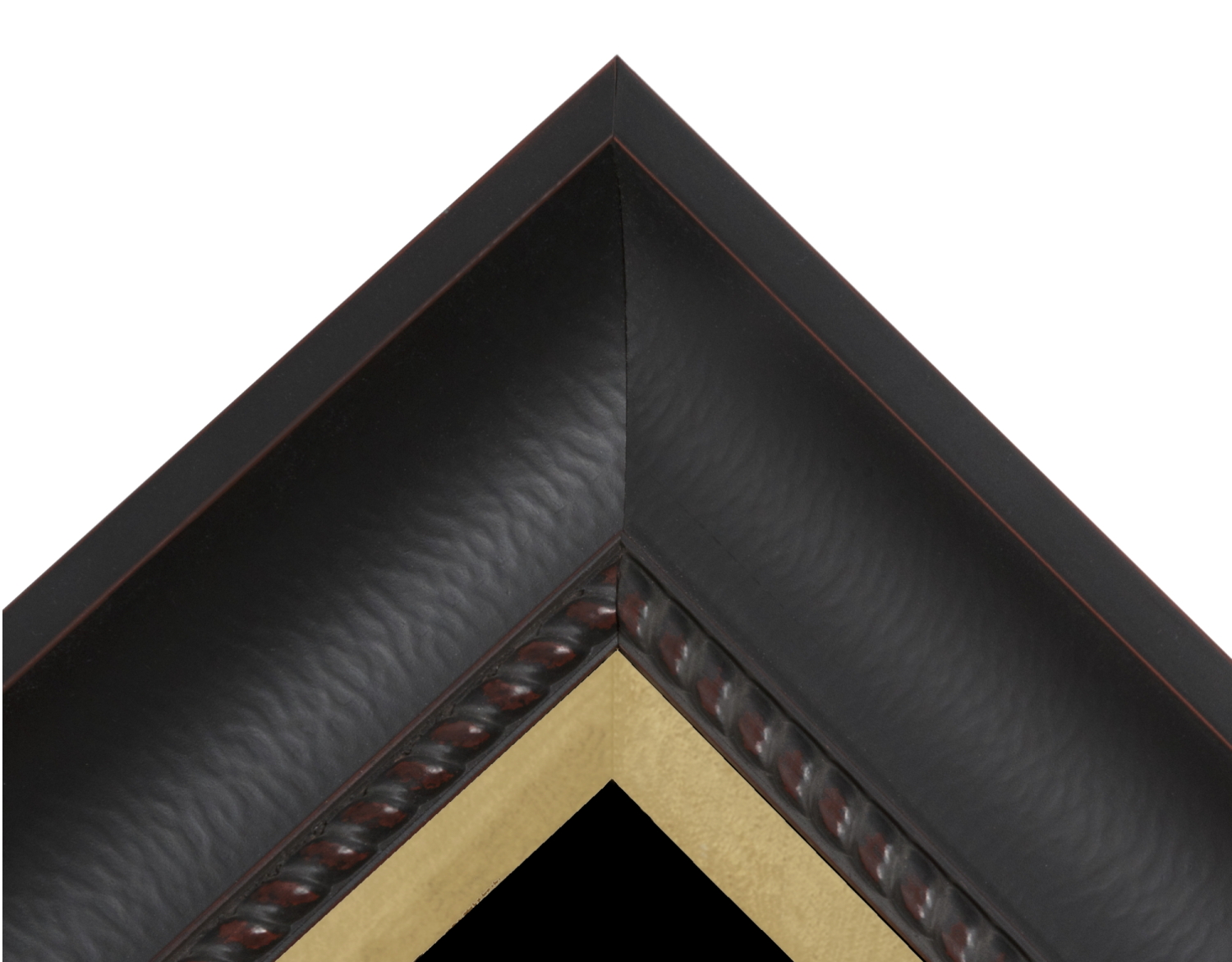 The background is 100% cotton twill, black in color, that has been washed and treated for colorfastness. The mount was placed in a deep, cove-shaped molding with a very dark brown surface, nearly black, with a rope-style inner lip, to which a light gold molding with a slightly beveled profile and a frosted surface was added as a liner. The glazing is U.V. protective acrylic (Plexiglas). Feel free to contact us for more details.