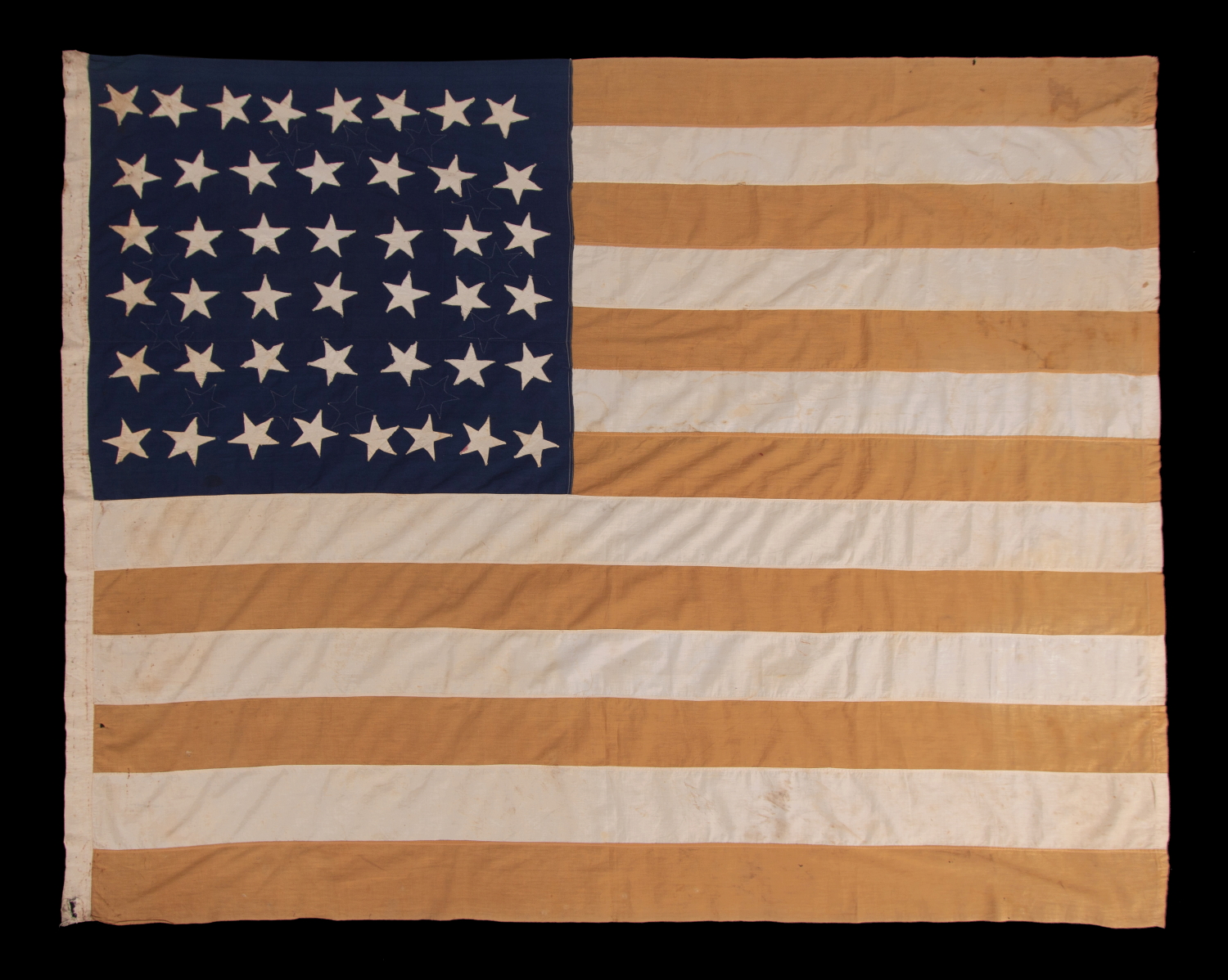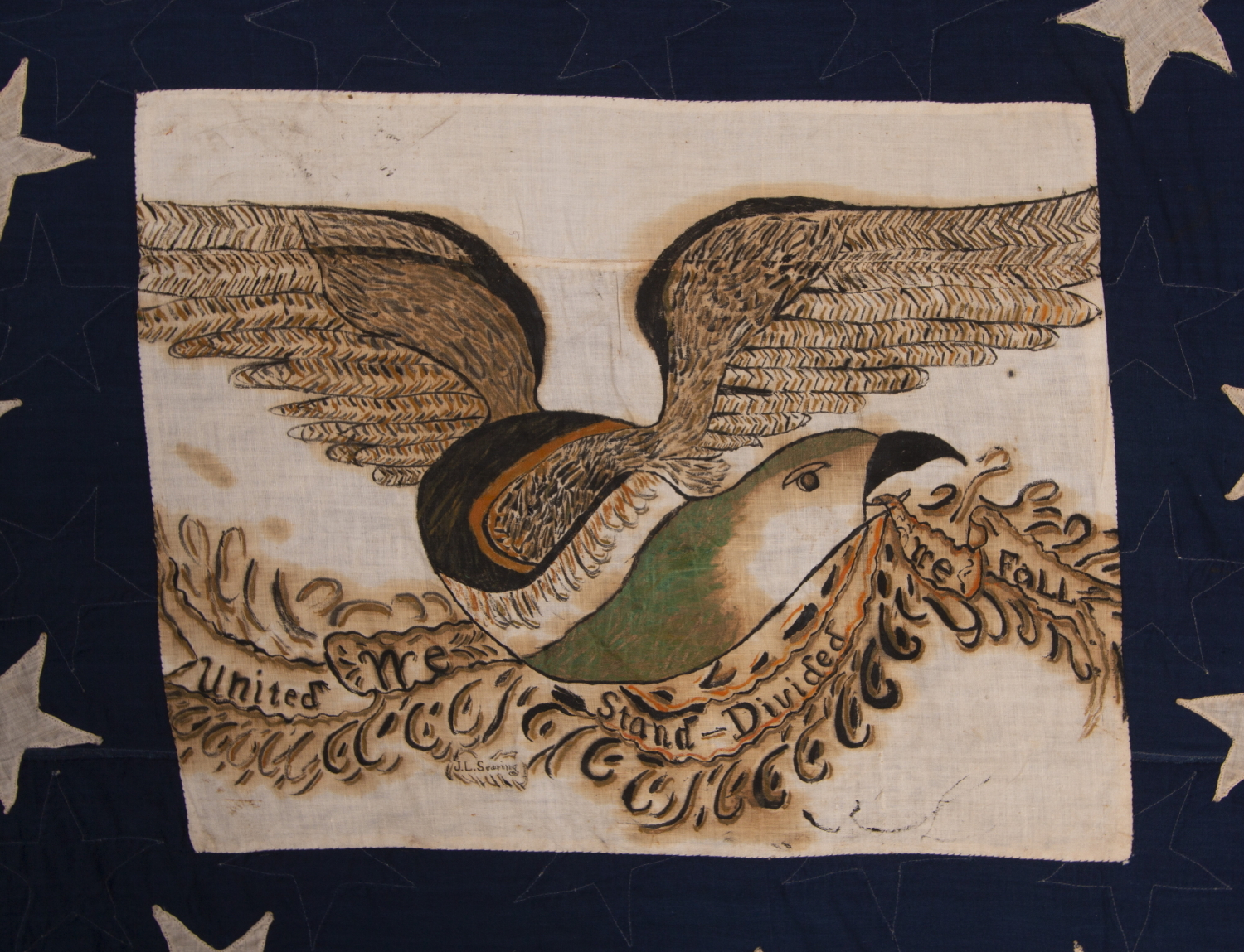 | Some of the rarest early American flags display different star counts on each side. With 44 stars on the obverse & 13 on the reverse, configured in a lopsided oval, the latter surround a hand-painted eagle with a garland-laden streamer that reads: "United We Stand, Divided We Fall." The 44th star reflects Wyoming Statehood, 1890-1896, while count of 13 celebrates the birth of America. The painted panel is signed "J.L. Searing" below the eagle. Three lines of blue, typeset, printed text read as follows: Geo. W. Ziders His Flag G.A.R. G.W. Ziders LOST spring kans. George W. Ziders fought with the 1st Illinois Cavalry during the Civil War as a member of Company A. Enlisting in 1861, he was wounded and discharged in 1862. Born in Pennsylvania, he moved to Illinois, before settling in Lost Springs, Kansas following the war. John L. Searing was likewise a Civil War soldier, who, before moving to Lost Springs, served in the 135th Illinois, a 100-day infantry unit. In a far-flung town of fewer than 300 residents, Zeiders and Searing, both IL Civil War veterans, would likely have been close associates in the local Grand Army of the Republic (G.A.R.) post. [full description with additional details forthcoming] |