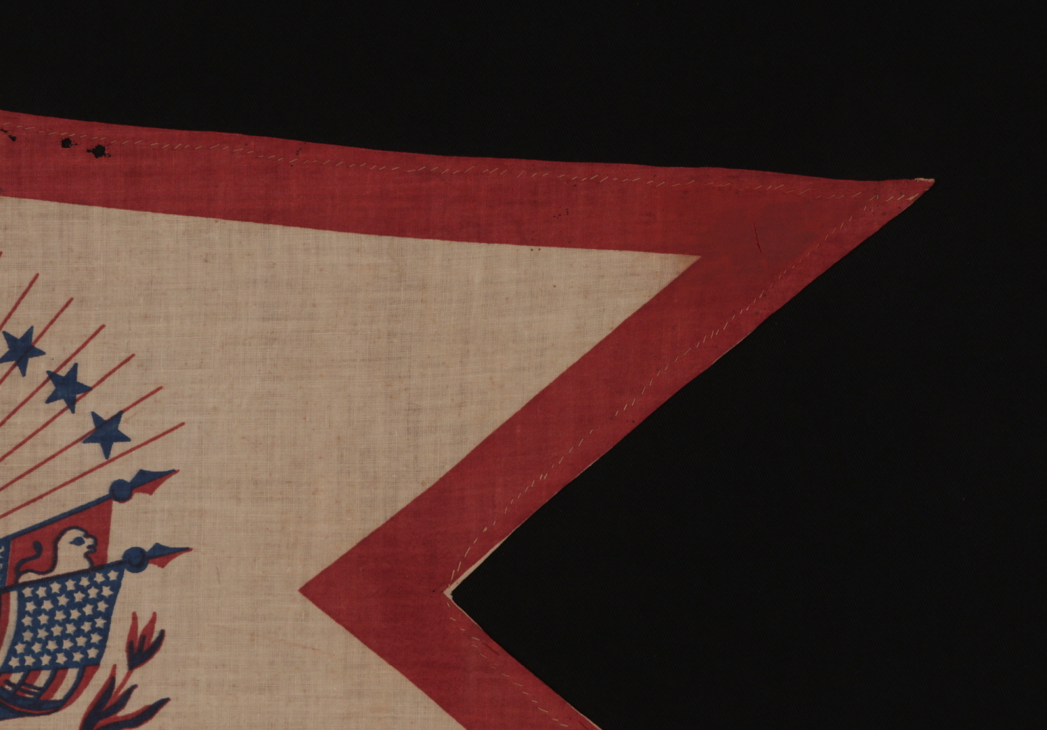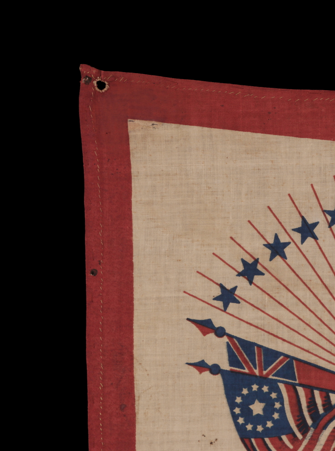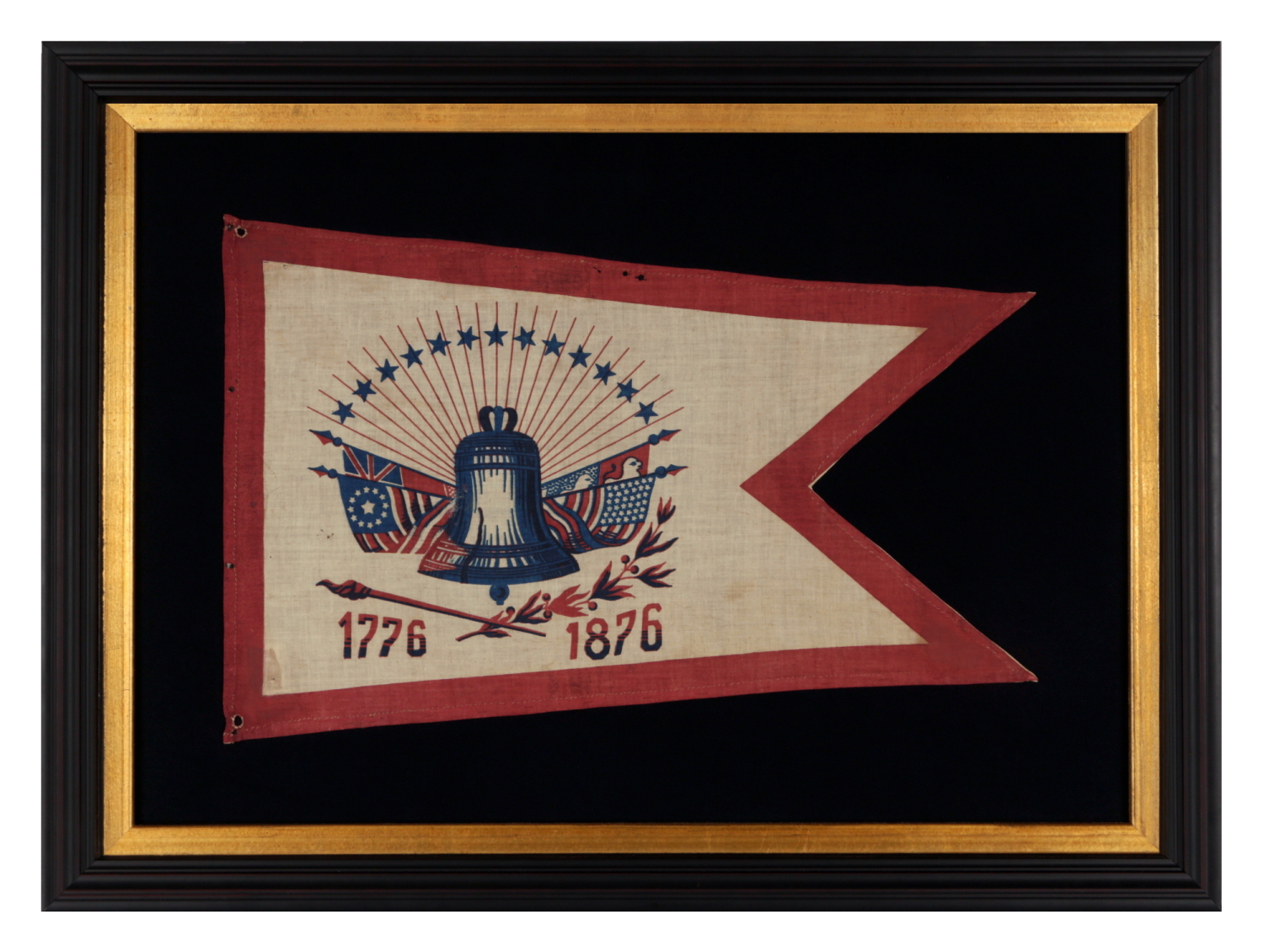 | Early American parade flag pennant / banner, printed on cotton, with a tapered, swallow tail format and a scarlet red border. In the center, block-printed in red and blue, is an image of the Liberty Bell, flanked and crowned by a beautiful, patriotic display of flags and 13 stars, interspersed with rays of the rising sun. Cradling the device are the torch of Liberty and what is either an olive branch of peace or laurel for victory and honor. Below, respectively smaller, then larger, are the dates “1776” and “1876”, to honor the national anniversary. Note how the flags in the background are of those of Britain—a Red Ensign and a banner with Lions of the monarchy--while those in the foreground are American. To the proper right of the bell is a 13 star American national flag, with its stars arranged in what is known as the 3rd Maryland pattern, to represent the original colonies, and a 37 star flag, to represented the present count, official from July 4th, 1867 – July 3rd, 1877. Though most examples of the Stars & Stripes displayed at the centennial displayed 38 stars, to welcome Colorado, which joined the Union on August 1st, 1876, or 39 stars, in anticipation that the Dakota Territory would also soon enter (as a single state), many patriotic objects, probably designed as much as a year prior, or even more, incorporated 37. Numerous styles of parade flag pennants were produced for the centennial celebration. Though I have been buying, collecting, selling, and observing them for decades, I have not before encountered this colorful variation. The election to show the Liberty Bell is notable in 1876 specifically, when this icon of American freedom was brought for the from Independence Hall. First cracked during its initial testing in 1752, with its larger and most famous, irreparable crack suffered sometime during the early 1840’s, it had been displayed on the hall’s second floor for about a quarter century. In conjunction with its removal, the much larger “Centennial Bell,” made in part from four cannons, one American and one British, from the Revolutionary War Battle of Saratoga, plus one Union and one Confederate, from the Civil War Battle of Gettysburg, was installed that year in the tower of Independence Hall, to ring in the July 4th holiday that year. Made to be tacked to a staff, to be waved or otherwise displayed at parades or political events, this basic type of parade flag-type textile is known to have been produced by numerous makers. Designed in various forms, some horizontal and some vertical, those made for the centennial specifically are very scarce. Most are so rare that they survive as either one-of-one or one-of-two or three among known examples. Similar designs were available from various flag-makers throughout the latter 19th century and the beginning of the 20th, who readily copied one-another to compete for the same clientele of political, fraternal, and veteran’s organizations, World’s Fairs, and all manner of patriotic events. Some had rectangular profiles, some had straight sides with swallowtails, some were tapered and swallowtailed, like this example. Others were triangular. They were usually available with an array of standardized imagery. In addition to dates, anniversaries, events, and holidays, they included presidential portraits, generals, names of fraternal groups and organizations, fire companies, Civil War corps badges, and a myriad of state seals. Templates with starred borders could be special-ordered with whatever one desired. One of the most notable and endearing traits of this particular pennant can be found in the four, carefully, hand-sewn, whip-stitched grommets along the hoist. Though initially affixed by metal tacks, a former owner evidently felt it deserved greater care and attention, through more appropriate and elegant means of display. Mounting: For 25 years we have maintained our own textile conservation department, led by expert staff. We take great care in the mounting and preservation of flags and related textiles and have preserved thousands of examples. The two-part frame consists of a shadowbox style molding with a step-down profile and a surface that is very dark brown—almost black—with reddish undertones and highlights, to which a black-painted, hand-gilded and distressed, Italian molding, was added as a liner. The background is 100% cotton twill, black in color, that has been washed and treated for colorfastness. Spacers keep the textile away from the glazing, which is U.V. protective glass. Condition: There is extremely minor soiling, in addition of a number of modest to moderate instances of the same along the perimeter, in both the red and white regions of the fabric. A combination of both professional cleaning and color restoration was employed—the latter by way of a reversible medium, to restore its presentation. Many of my clients prefer early flags to show their age and history of use. |