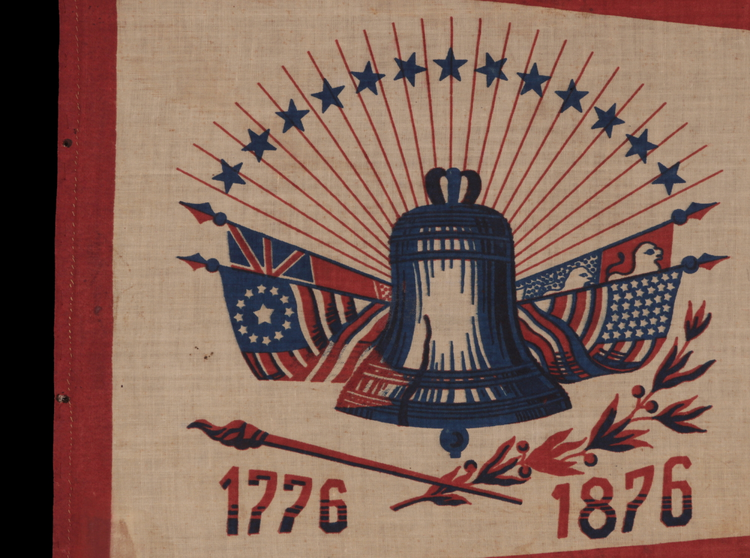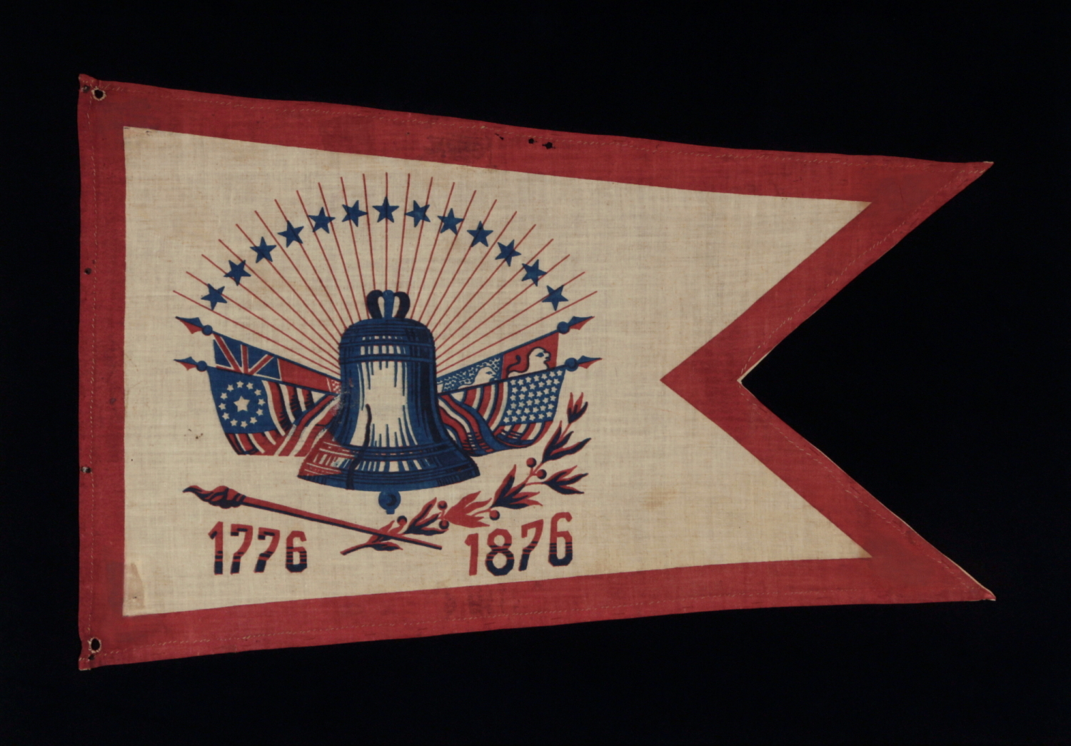 | SWALLOW-TAILED PARADE FLAG PENNANT / BANNER WITH AN IMAGE OF THE LIBERTY BELL BEFORE A FANNED ARRAY OF FLAGS & 13 STARS, MADE TO CELEBRATE THE 1876 CENTENNIAL OF AMERICAN INDEPENDENCE, UNIQUE AMONG KNOWN EXAMPLES |