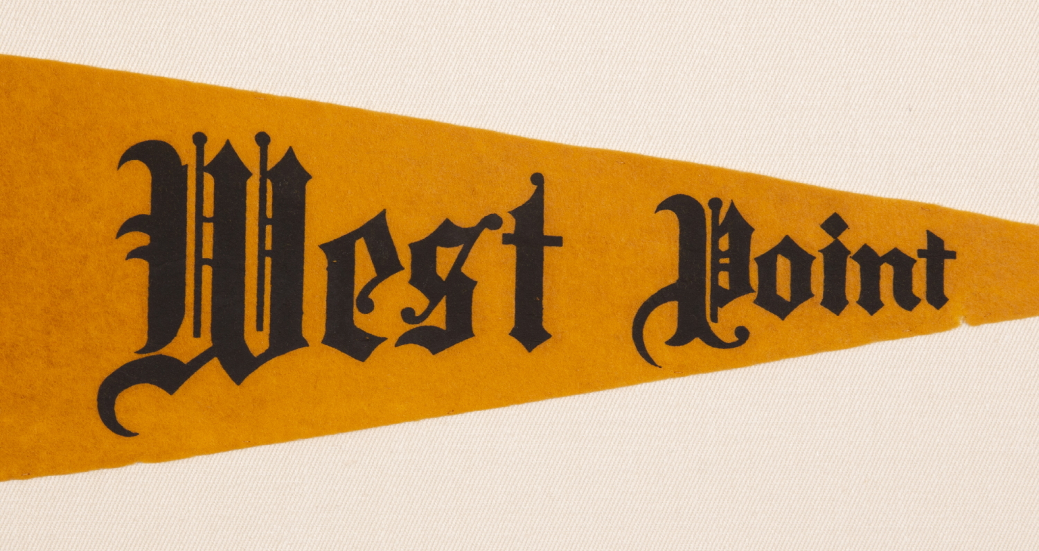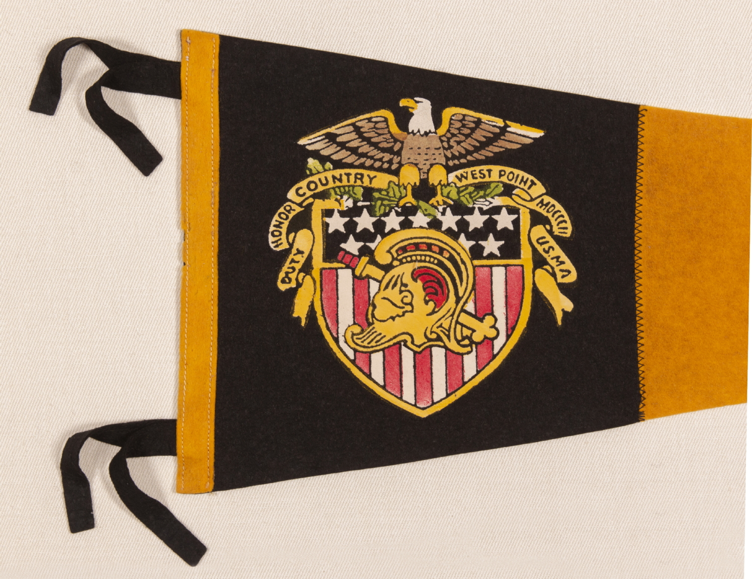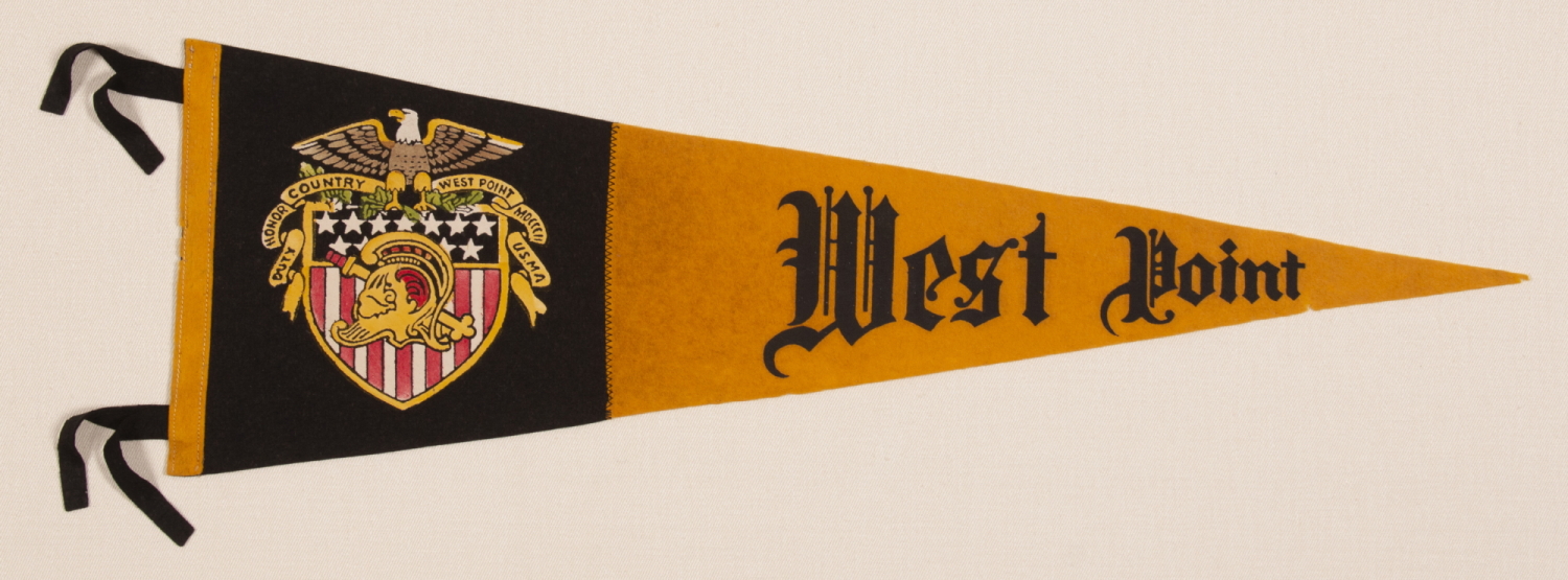 Triangular pennant, made for the United States Military Academy at West Point, with exceptional colors and graphics. Made of golden yellow and black felted wool, the Academy's coat of arms appears first, toward the hoist, on a black register that comprises about 2/5 of the length of the textile. Printed in yellow, red, white, green, and brown, the colorful image consists of a spread winged eagle, perched upon a federal shield with 13 stars and 13 pales (vertical stripes) in red and white. Along the top edge of the shield is what appears to be a single arrow. Branches of oak leaves are grasped to the left and right. Emerging from behind the eagle is a billowing streamer that reads: "Duty, Honor, Country" the Academy's motto, with “West Point,” followed by the date of its founding in Roman numerals, "1802," and “U.S.M.A.” A sword and the helmet of Athena, Greek Goddess of War, are superimposed upon the shield.