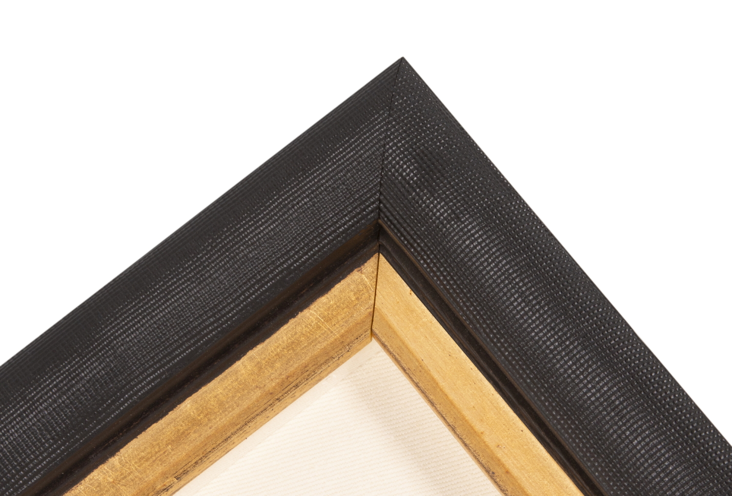 The background is 100% natural hemp fabric or a hemp and cotton blend, ivory in color, with a twill weave. The two-part frame consists of a black-painted, shadowbox style molding with a bowed face and a textured surface, to which a black-painted and hand-gilded Italian molding, with a beveled profile, was added as a liner. A shadowbox was created to accommodate the ties, which were mounted in a 3-D fashion. The glazing is U.V. protective acrylic (Plexiglas).